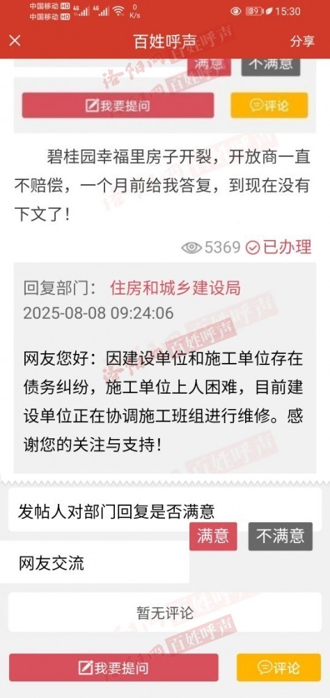 碧桂园幸福里二期,从发现质量问题到现在快一年了,维修工作到现在还完成,施工方三建公司维修进度非常缓慢,一会儿公司没钱了一会儿找不到工人,补偿问题只字不提。我就想问问贵局,这房顶开裂属于质量问题,当时的施工方,监理方,验收方都是怎么负责的?有没有猫腻?!老百姓买个房子真不容易,但是到现在还没住进去,我们该找谁寻求帮助,反映了好多次,不是说工作人员离职就是开放商困难!我们不要解释,我们要的是问题能解决。恳请贵局能彻底解决我们的问题,而不是找各种理由。谢谢