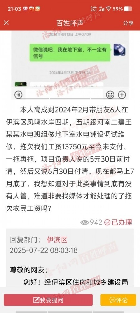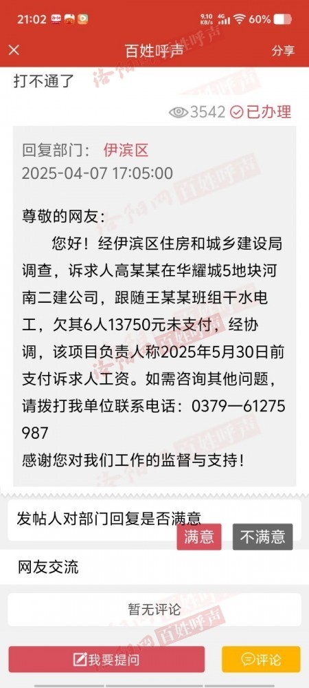 您好!经伊滨区住房和城乡建设局协调,该项目河南二建负责人反馈该班组工人工资,班组长王某某正在编辑造册,待核实无误后预计2025年10月31日前(节后)将对其进行支付。