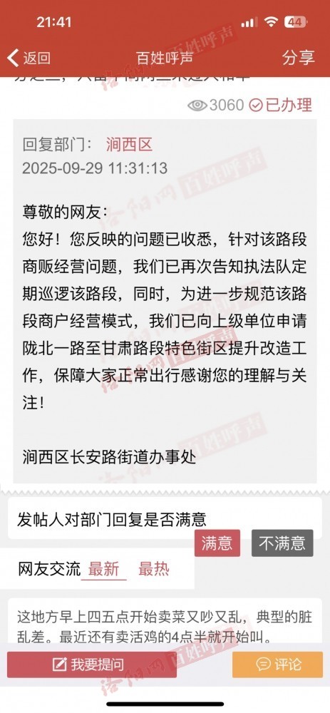 已经投诉五次了,希望这个数字不要再增加了,就这么多的公信力被你们一再败落!回复称“我们”在督促巡逻队定期巡逻,这里我想问一下“我们”代表的是谁?你们督促巡查你们去看过了吗?巡查怎么做的你们知道么?“定期”指的是多长,一天一次还是一周一次还是你们也不知道?只管照样回复不用承担任何责任!希望回复的人真正的去现场解决问题,随时奉陪!没有解决问题你们就这样敷衍了事,官僚主义,四风也该整治了。同时敷衍回复报上级改造,请回复上报的内容和上级批复的都告诉我们!我现在说的是占道经营整治,取消马路市场还我们居民安静,干净,安全的生活环境!我们的要求过分吗?非要我们老百姓生活在这种环境里吗?你们是在为老百姓着想吗?还是有不可告人的交易?总有些商贩常年占据公共区域,谁给他们的胆子,是不是该查一查!提出的所谓改造你们在拖延什么?在敷衍什么?在干什么?只有一个要求取消马路市场还我们生存空间,否则一切免谈!!照片里的你们回复后的街道,看看吧!