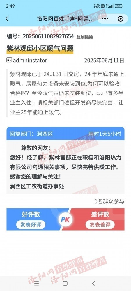交房快两年,从三月份开始通过各种渠道维权,街道办事处,六月份督促到现在,都有什么实质性进展?热力公司到现在没有收到开发商申请供暖,交换站至今没有施工。四个月过去了,现在一直就这样拖着,问题一点没解决,到底还需要多久进场施工,街道办和热力公司说法都不一致。