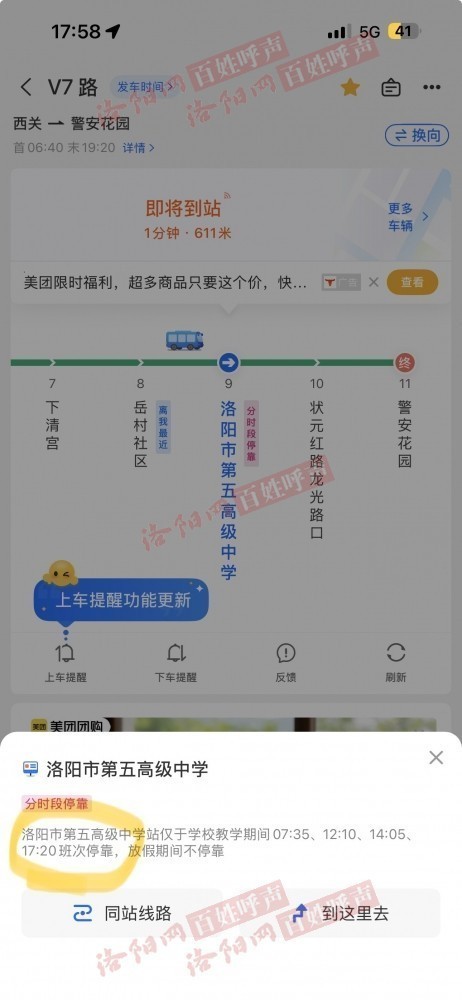 我在第五高级中学的门口等车,手机上显示v7路公交17:20有一班在第五高级中学的门口,我从17:09等到17:30都没有来!我知道节假日是没有五高这一站的但今天并不是节假日今天是周二因该有的。我就走到下面的岳村社区站等公交等到6:02才来了一班公交我想知道为什么17:20的公交没有准时到达还有能不能增加一下v7公交的数量等一班公交要快一个小时