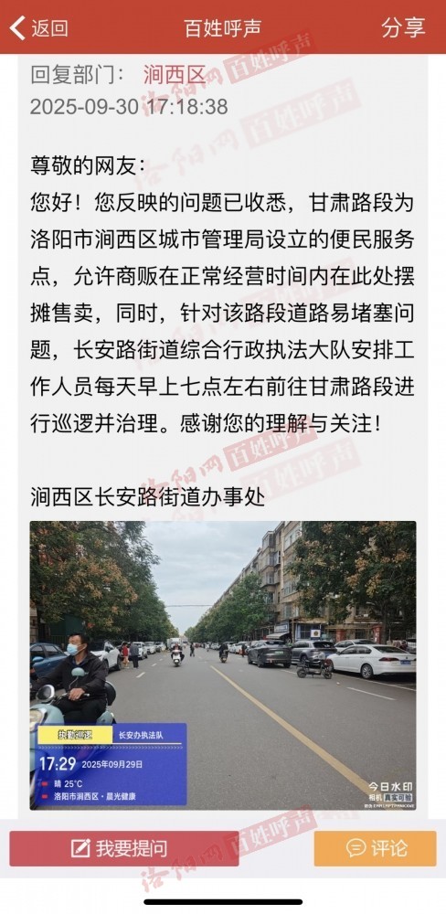 再问甘肃路占道经营,回复终于说清了甘肃路长期的现状是你们城市管理局造成的,你们打着便民服务点的设立来回复是你们为了老百姓,难道我们投诉的就不是老百姓的心声吗?我们的生活环境不容你们践踏!你们有什么权利代表我们,我们不需要你们设置便民服务点!!!!再说便民服务点是便民服务街吗?口口声声你们设置的,贴出文件公示来!回复的照片显示很好啊,不堵啊!你们宣称的七点巡逻,为什么没有你们宣称巡逻时候的照片,为什么是下午五点半的,糊弄谁呢?还是不敢发?上次追问的定时巡逻是不是每天就下午五点半一次?公示你们巡逻的要求!我给你们发一张早上七点的!什么是人民至上?糊弄人民的人早晚会有下场的!再次严正声明取消不便民的便民点!