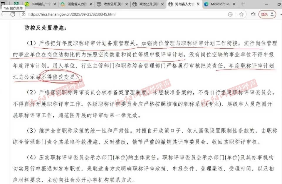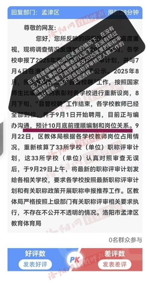 根据河南省明确规定,职称评审必须先备案公示,后执行。我区2025年度的职称计划已于7月4日在洛阳市职称网正式公示。 然而,9月29日,在评审即将开始前,区教体局却突然口头通知各学校,下发了全新的职称计划,大量削减原有指标。更令人震惊的是,教体局在回复中承认,其所依据的“县管校聘”编制数据,要到10月底才能理顺!这意味着,他们在数据根本没确定、更没有完成省级平台备案的情况下,就强行推出了新计划。这种“先斩后奏”的行为,完全颠倒了法定程序。
