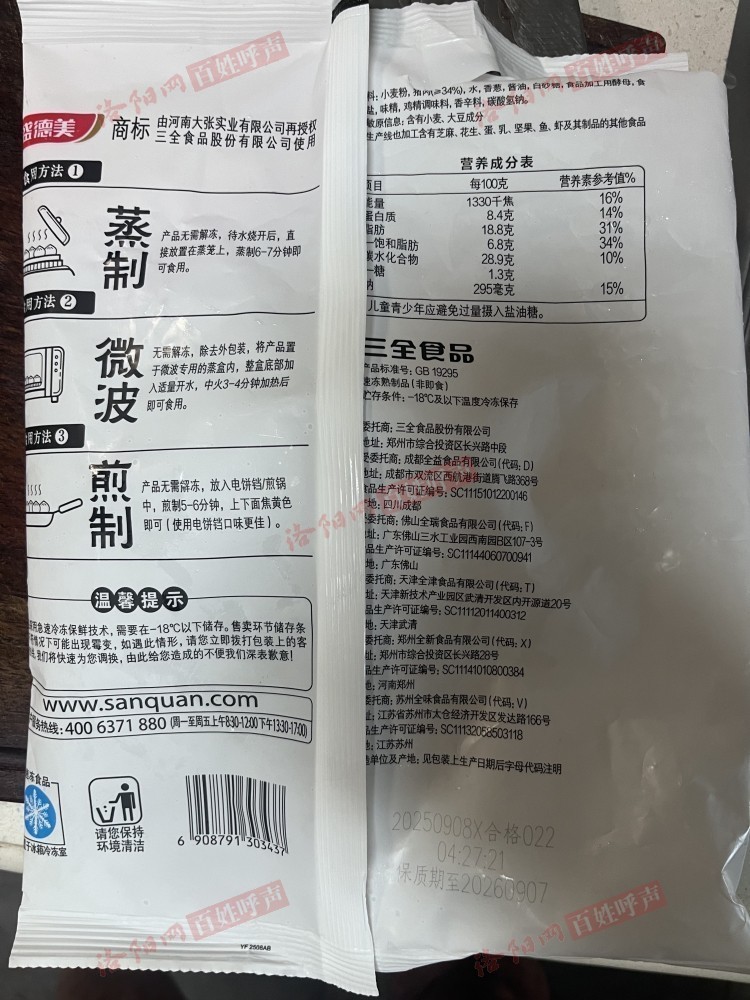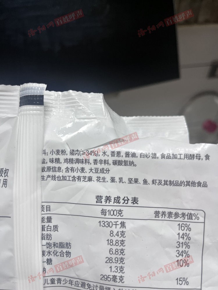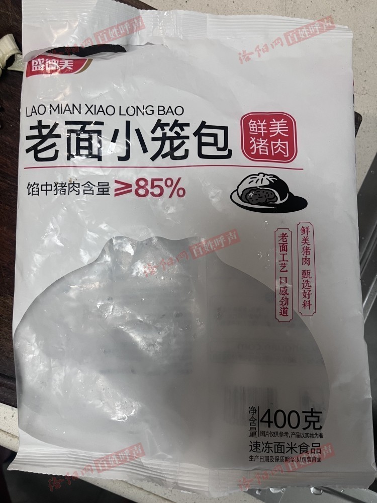 大张景华路盛德美买了一袋大张自营的老面小笼包冷冻食品,正面大字写着猪肉含量大于等于85%,背面配料表小字却写着猪肉大于等于34%。