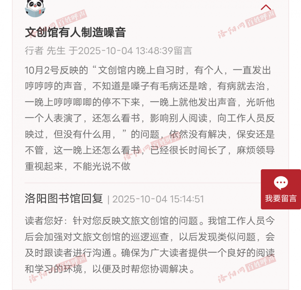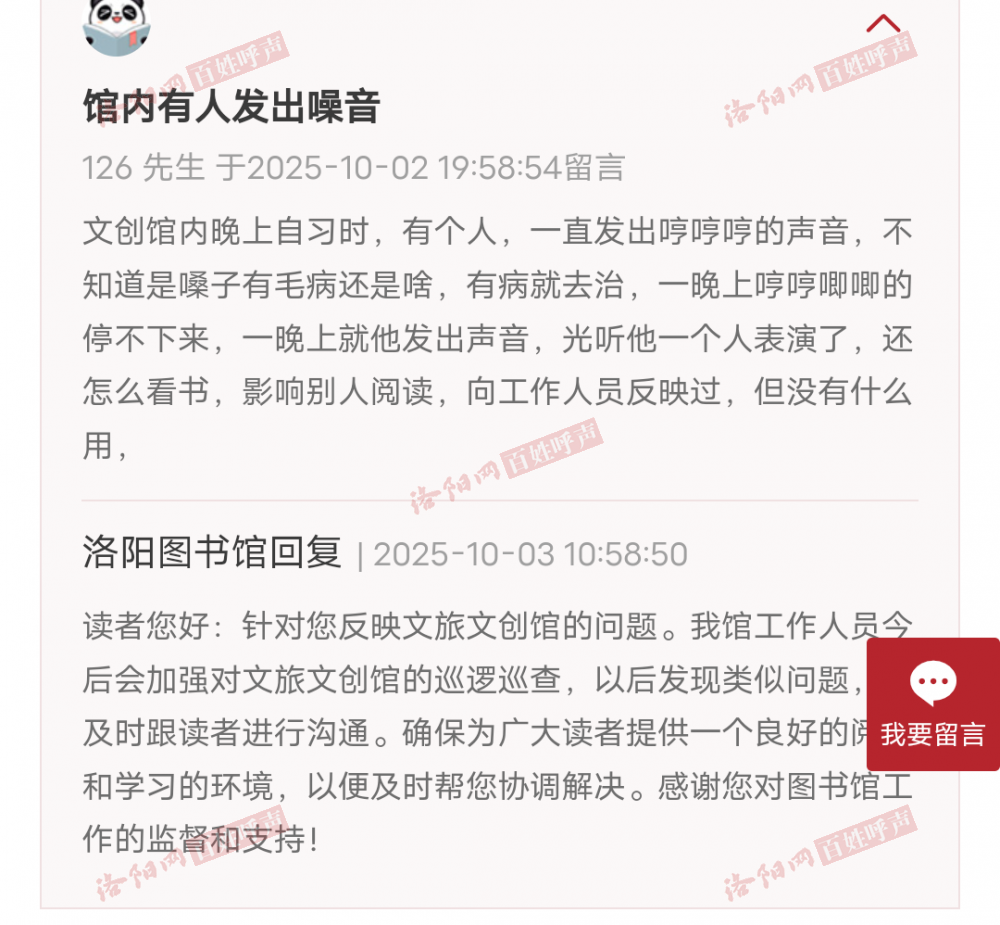 洛阳图书馆内有人制造噪音,多次反映无人管理