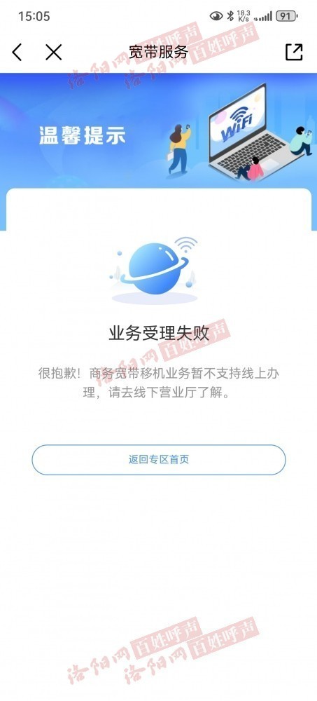 21年左右在涧西区中信重工青年公寓安装了一条网线,现在需要迁入伊滨区,去当地营业厅办理说线下无法办理,让线上办理。中国移动app里面“宽带移机服务”显示业务受理失败,说网络性质属于商用宽带,直接打10086也说人工客服繁忙无法转接。之后在中国移动公众号上面成功接入人工客服,客服告知因不明因素无法进行业务办理,等待回访电话