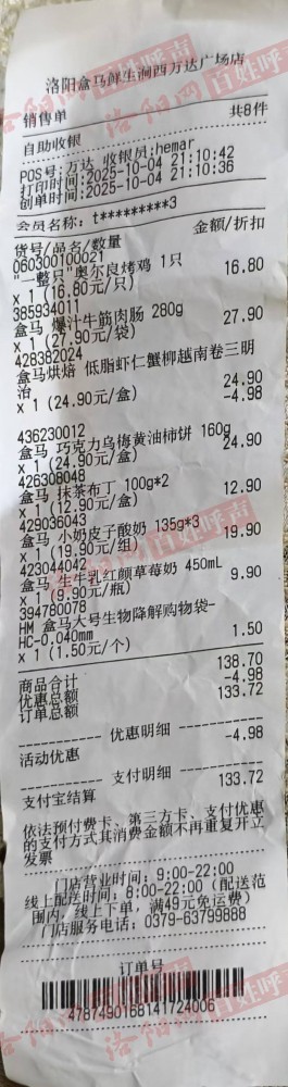 洛阳盒马鲜生店食品吃出毛发壮异物