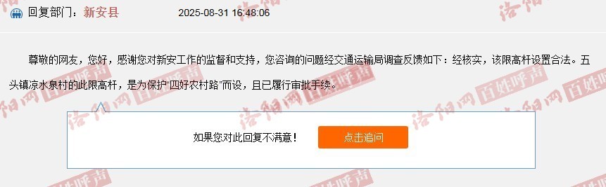 新安县五头镇磁五仓路凉水泉路口的限号杆何时恢复?既然是政府审批通过的,怎么能随意拆除,请立即恢复限高!!!!