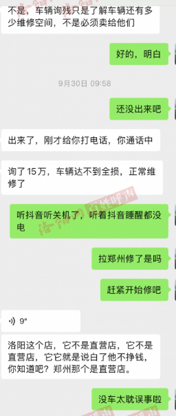 2025年9月22日本人驾驶一辆混动新能源理想牌汽车,在洛阳市涧西区名门微生活停车场发生事故,事故原因是停车场地砖翘起导致底盘油箱电瓶等其他配件损坏,当时报警,报保险,随后4s店工作人员来把车开走,告知损失过大建议我走询残,询残的意思就是车不修让保险公司拍卖,拍卖后给我赔付看我是否满意,我同意询残,9月30日讯残结果出来保险公司告知我询残拍卖最高有人出价152000元,不够车辆全损金额,正常维修了。然后给我打电话问我想要多少钱,我说23,他说目前车辆洛阳理想维修店不愿意修说不赚钱(这句话是他在骗我)理由是保险公司跟洛阳理想店维修合作折扣9折。郑州是直营店利润高点维修是9折。我说那就安排郑州维修吧,保险公司回复可以,下午让他郑州同事联系我,第二天也没人联系我,我就电话问定损员他说我的车辆洛阳和郑州都不愿意修,之前就一直多次告知洛阳维修店不愿意修,郑州愿意修,现在告诉我洛阳郑州都不愿意修,我做为一个消费者买了保险,应当享受理赔我买的也是全险,车辆全损金额是285000怎么会不愿意修?买辆新车都快够了,于是我联系洛阳理想维修店工作人员,人家告知我从来没说过不愿意修,可以修的只是考虑到汽车更换电瓶后价格贬值建议我走询残,经过沟通洛阳理想维修店明确告知我人家愿意维修。随后我联系保险理赔人员他拉了一个微信群拉了我和洛阳理想维修店工作人员,在群里发了个信息:车辆正常维修,费用咱们后期协商没问题吧,就发了这一句话,一直拖到现在没人给我联系,保险公司投诉电话95519我打了很多个,没有一点作用,后面理赔员联系我说要宁德时代人去看了电瓶才行,宁德时代已经告知电瓶无法维修,然后他一天不理我,今天我又打了投诉电话理赔员联系我说要宁德时代出检测报告才行。9.22日报案,现在定损都不给我定损,导致车辆无法给我维修,这么大企业还有信用可言吗,小钱就赔金额大就使劲拖,还有4s店估算维修金额报案当天就发出来电瓶8万多油箱5000多还我其他杂七杂八下来98000元。询残金额拍卖了152000元,➕一起就25万了,他问我想要多少我说23,他还给我墨迹说这个要等总公司大型更换电瓶才行,不过让我不要高兴太早,总公司可能不同意,我不想墨迹等待,因为没车开很不方便,我就要求维修,因为让他赔钱他就使劲墨迹想让我降价,让他修他们又这么墨迹,他们工作质量真的太差了。开车这么多年买保险的钱最少也有10万,遇到事故这种理赔质量,我想我以后真不愿意在买了,聊天记录,保险单号,我截图上传