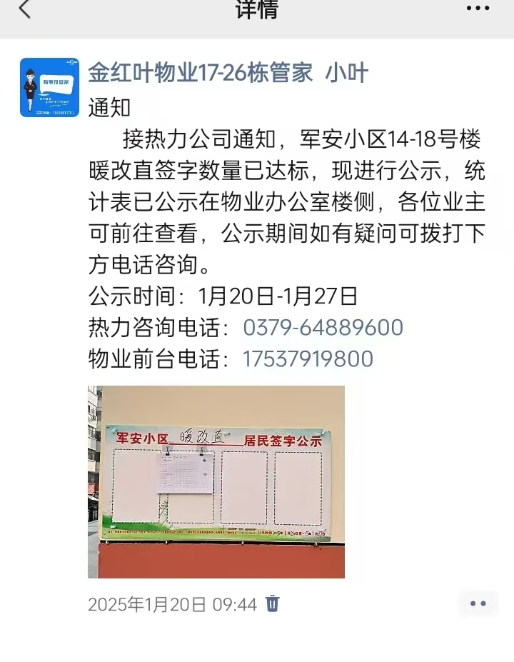 您好!您反映的问题已收悉,军安小区暖气转改直,当时改造前小区物业在公示栏张贴有通知。感谢您的理解与关注!