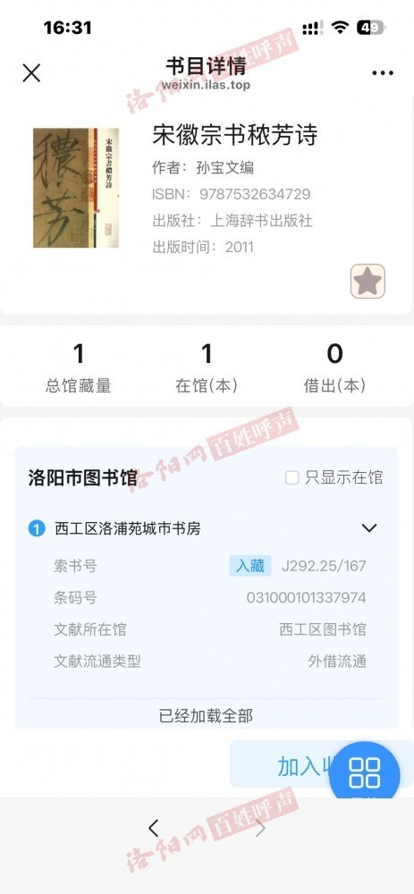 洛阳图书馆小程序搜索书籍名称两本书籍都在西工区洛浦苑城市书房“ 宋徽宗瘦金体墨迹J292.25/160”和“ 宋徽宗书秾芳诗J292.25/167都为在馆入藏未借出状态,本人两次西工洛浦苑书房查找,工作人员也帮助查找,今天又冒雨去洛浦苑书房查找都未能找到任何一本书!难道图书馆的书籍从来不盘点?管理如此混乱不堪么!如果图书灭失请不要在小程序没显示正常馆藏状态,误导读者跑冤枉路!