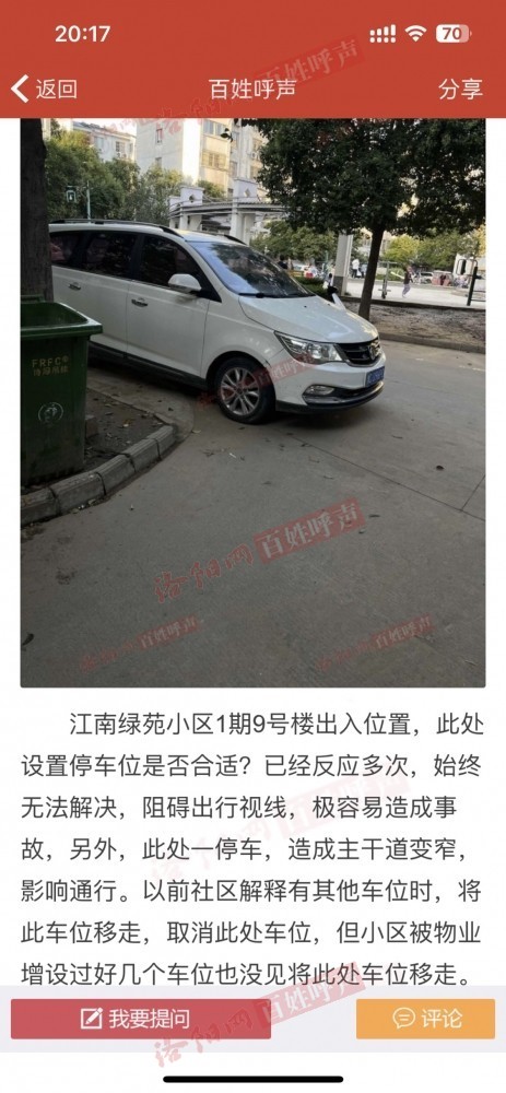 江南绿苑1期9号楼出入主干道位置设置停车位,阻挡9号楼居民出行视线,存在巨大安全隐患。上次发贴相关部门回复只是说向内扩路40公分,扩大了主干道。但向内扩路后就能不让9号楼居民出入主干道不阻挡视线了吗?回复部门请亲自看看这位置设置停车位是否影响出行视线!!另外,明明新设置了好几处停车位,就为了多收钱,始终不取消此处停车位,物业还借口没有位置了,请相关部门想好再解释处理方法