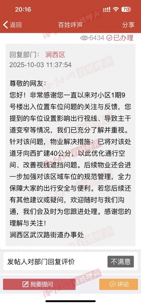 江南绿苑1期9号楼出入主干道位置设置停车位,阻挡9号楼居民出行视线,存在巨大安全隐患。上次发贴相关部门回复只是说向内扩路40公分,扩大了主干道。但向内扩路后就能不让9号楼居民出入主干道不阻挡视线了吗?回复部门请亲自看看这位置设置停车位是否影响出行视线!!另外,明明新设置了好几处停车位,就为了多收钱,始终不取消此处停车位,物业还借口没有位置了,请相关部门想好再解释处理方法