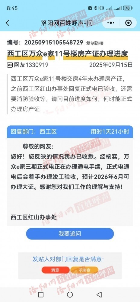 万众e家11号楼交房5年了未办理房产证,西工区红山办事处回复正在进行正式电通电,预计26年中才能办理房产证,请问目前进度如何,能不能督促开发商早点办理房产证?