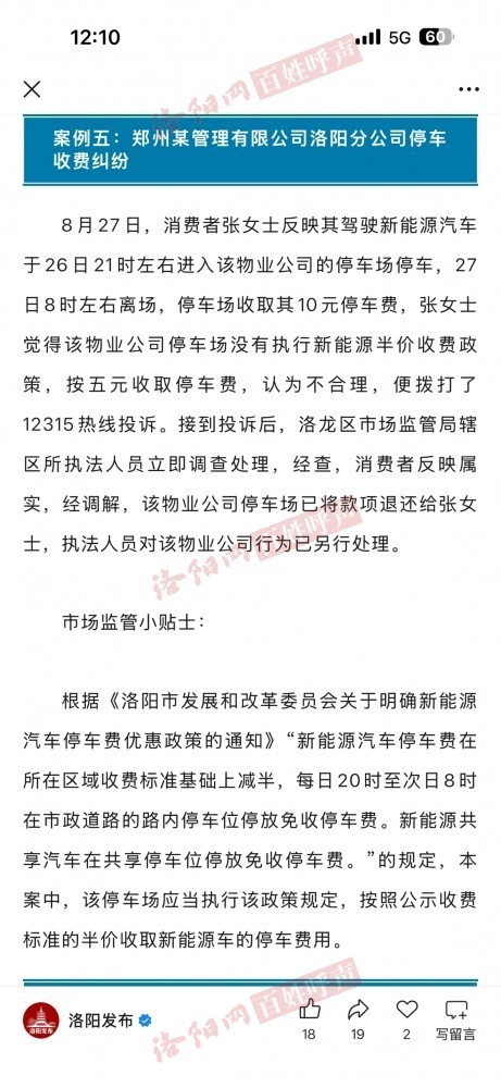 之前涧西区有反馈这个停车场是自建停车场,没有明确规定只需要公示即可,但是根据《洛阳市发展和改革委员会关于明确新能源汽车停车费优惠政策的通知》“新能源汽车停车费在所在区域收费标准基础上减半”,而且百姓呼声上其他区县也有反馈类似的问题,对应区县有关部门都及时做了纠偏。所以问题来了,洛阳市发改委对于新能源汽车停车优惠的政策是不是不对涧西区适用,如果适用,那为什么执行完全不一。街道办社区是不是直接拿着物业给的回复,不做调查直接复制粘贴在这里反馈?