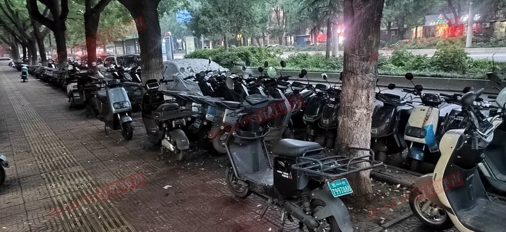 中州西路长春路口,二轮电动车大面积堵塞人行道