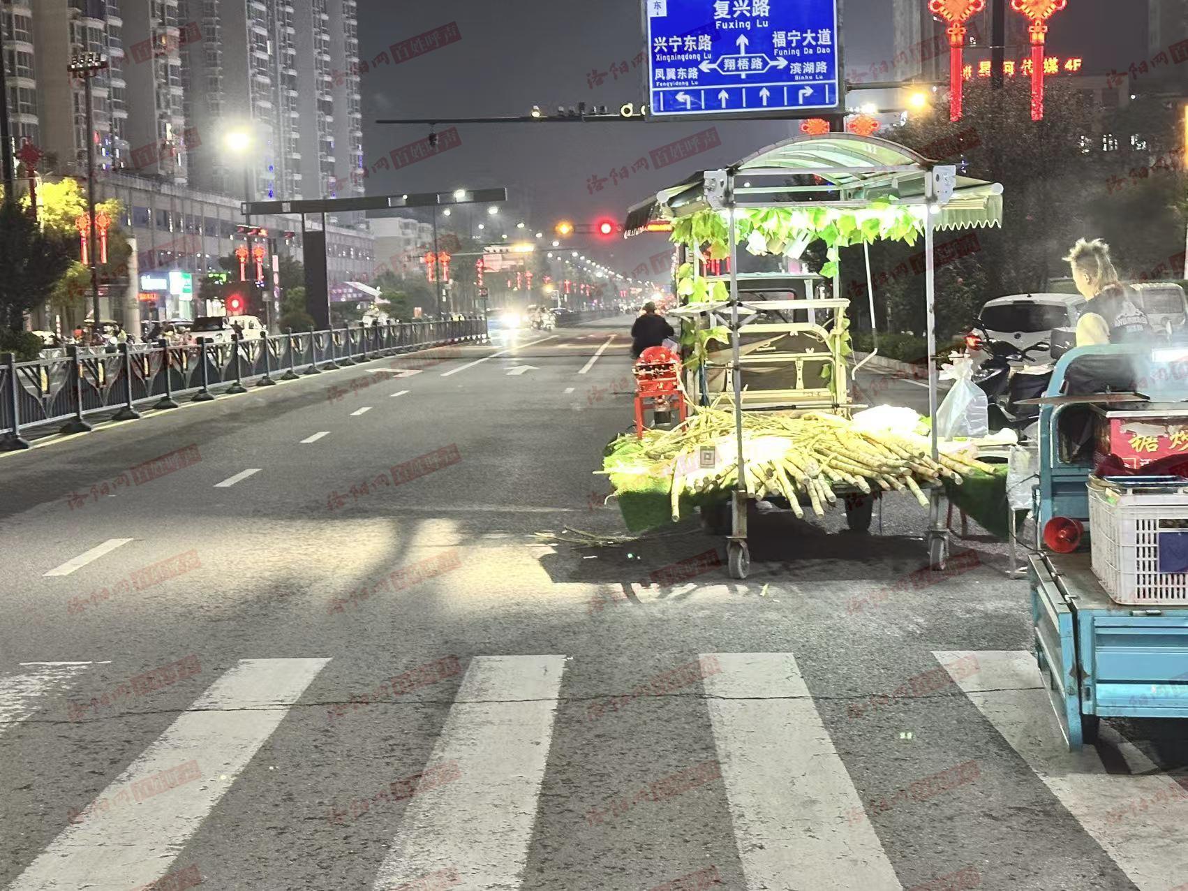 洛宁县永宁大道公安路口南边夜市摊摆在主路中间,影响交通