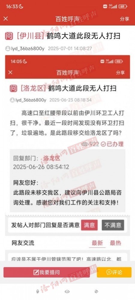伊川红腰带到高速路口鹤鸣大道东侧非机动车道无人打扫,垃圾遍地。持续好几个月时间了,伊川说移交给洛龙了,洛龙说未移交,这是踢皮球呢。