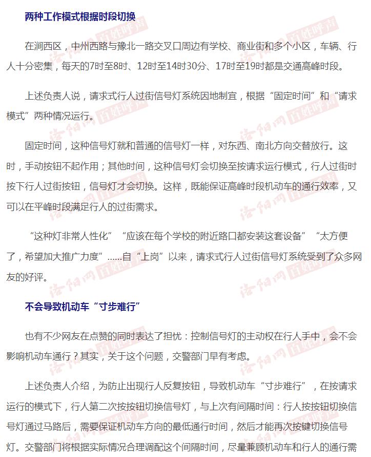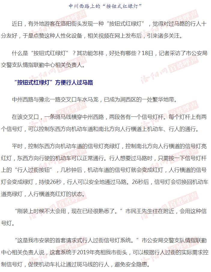 早在去年年初,洛阳网,及洛阳记者,都已经大力称赞了洛阳市区安装的“按钮式红绿灯”给洛阳的交通带来巨大的便捷,与安全,同样也得到了外来游客的称赞
