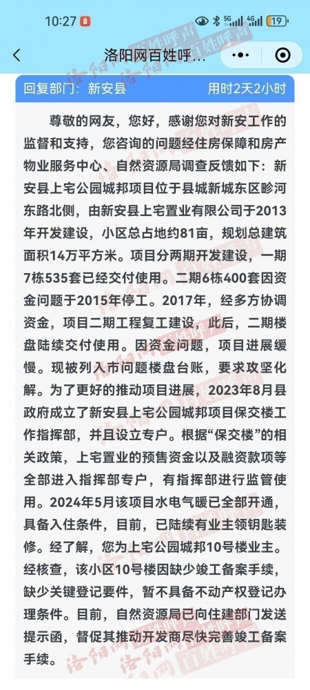尊敬的网友,您好,感谢您对新安工作的监督和支持,您咨询的问题经住房保障和房产物业服务中心、自然资源局调查反馈如下:新安县上宅公园城邦项目位于县城新城东区畛河东路北侧,由新安县上宅置业有限公司于2013年开发建设,小区总占地约81亩,规划总建筑面积14万平方米。项目分两期开发建设,一期7栋535套已经交付使用。二期6栋400套因资金问题于2015年停工。2017年,经多方协调资金,项目二期工程复工建设,此后,二期楼盘陆续交付使用。因资金问题,项目进展缓慢。现被列入市问题楼盘台账,要求攻坚化解。为了更好的推动项目进展,2023年8月县政府成立了新安县上宅公园城邦项目保交楼工作指挥部,并且设立专户。根据“保交楼”的相关政策,上宅置业的预售资金以及融资款项等全部进入指挥部专户,有指挥部进行监管使用。2024年5月该项目水电气暖已全部开通,具备入住条件,目前,已陆续有业主领钥匙装修。经了解,您为上宅公园城邦10号楼业主。经核查,该小区10号楼因缺少竣工备案手续,缺少关键登记要件,暂不具备不动产权登记办理条件。目前,自然资源局已向住建部门发送提示函,督促其推动开发商尽快完善竣工备案手续。