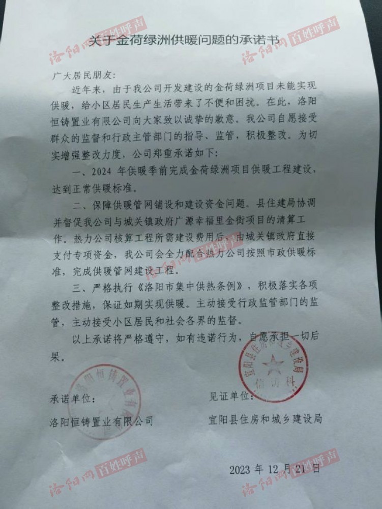 我是宜阳县金荷绿洲小区的一名住户!金荷绿洲小区300多户住户已缴纳暖气初装费四百多万!被无赖开发商私自挪用用于其他开发项目!长达八年之久!不把这些初装费交给供暖公司!供暖公司因资金不到位无法进行暖气管道施工!导致小区入住多年至今无法供暖!这期间经小区业主不断寻求河南电视台,和县有关部门,县住建局等单位的帮助!和协调努力!2023年县住建局出面和恒铸置业公开承诺并出示书面保证2024年供暖季保证供暖,书面保证上盖有住建局和开发商的公章!然而并没有什么卵用!至今没有任何施工迹象!小区没有任何动向和进展!经了解开发商和县政府存在债务纠纷!导致开发商私自挪用住户缴纳的暖气初装费而无所顾忌!住户多次上访反映,县相关部门的信访过于书面!并没有实质性解决问题!每次回复说是在施工!然而并没有任何施工的动向!不知道这是什么行为!在敷衍我们还是敷衍上级部门!在这希望市有关部门有关部门能够介入调查!帮帮我们这些社会底层的老百姓吧!给我们这些无辜住户一个公道吧!!!