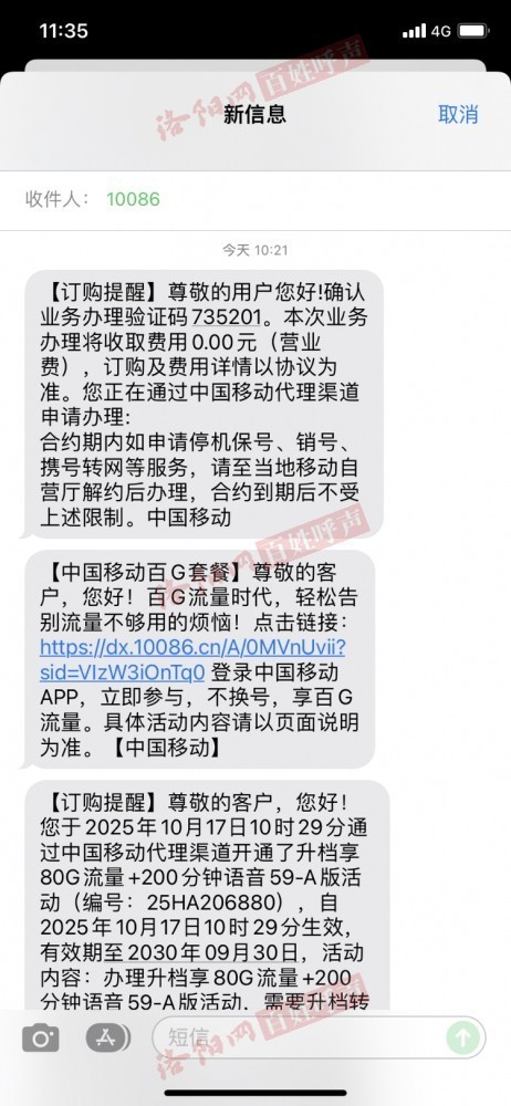 早上接到中国移动电话,说是涧西营业厅的,回馈老客户送流量,无费用,并反复确认,说了入网时间没费用,通过10086官方发了个验证码,这样才相信不是骗子,跟她说了验证码,挂了电话,没想到几分钟就收到了升套餐绑定5年的短信,实在让人生气,这样搞是演都不演了吗?吃香这么难看