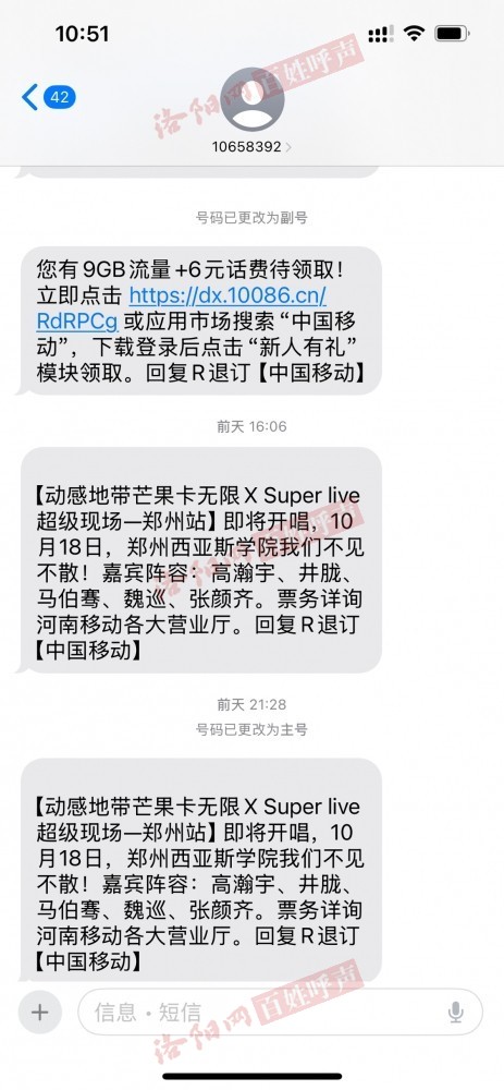 本人之前使用联通号码几十年,没有什么推销广告之类的短信,自从孩子上学转成移动号码以后,天天被移动的垃圾短信骚扰,是不是还有本地客服打电话推销业务,更可恶的是10086也打电话,多次投诉屏蔽得不到解决,本人生活受到严重影响,而且自己信息严重泄漏,对于移动失望透顶,作为全国三大运营商之一这点事情和服务都做不好靠天天打电话推销业务以后谁还会用你们移动卡,真垃圾,作为监管部门监管不到位也有失职职责,请平台给个合理解释。除了上传的截图还有很多删掉的,几乎隔一天一发短信,频繁的时候一天一发还打电话。