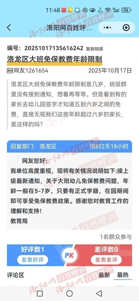 你好 我想咨询一下 洛龙区幼儿园大班免费政策和收费标准多少 有没有年龄的限制 我家孩子在洛龙区龙祥实验幼儿园上大班 幼儿园通知2019.9.1出生的到2020.8.31出生的儿童享受政策 可我在10月17号的百姓呼声中 看到了一个提问也是关于保费的 说是5到7岁有学籍的儿童都可享受免费政策 现在我就想知道龙祥幼儿园的年领限制是否合理 具体政策是否发布 年龄这块有没有具体限制