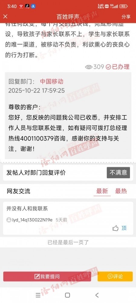 10月21投诉中国移动学护卡信号差,10.22回复已派人与我联系,真像是截止目前并没有任何人与我联系,更没有做出任何改变,政府设的投诉平台,中国移动居然回复说已与我本人联系