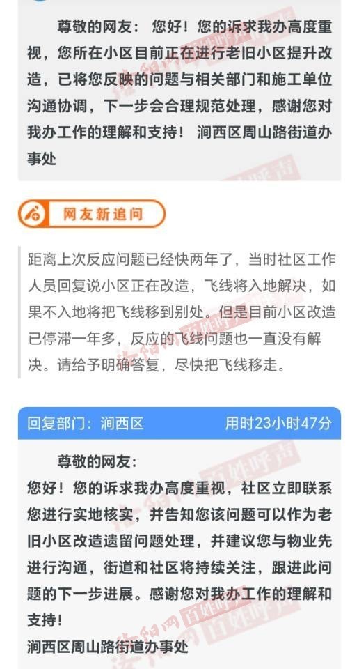 小区的弱电飞线固定在我家阳台上,对我家阳台造成安全隐患,前年投诉后,社区说小区正在改造,弱电飞线将入地解决,后小区改造停滞至今。今年五月份又投诉,社区和物业领导都到现场查看,物业经理随后向弱电飞线相关单位人员通知沟通,弱电飞线相关单位人员第二天来到现场查看并上报,说给移走。后他们给小区物业经理的答复是两个月之内小区飞线入地将开始施工,先不移走。时至今日已过三个多月仍无动静,且小区改造后续收尾工作并...