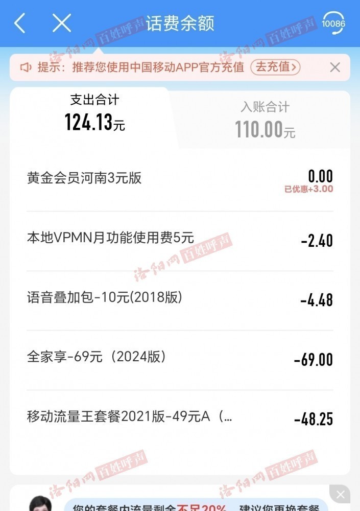 9月20日上午9点左右,我父亲到栾川县中国移动河南店交一百元话费,营业员拿起手机说老卡,然后一番操作,没经主人同意定制了生活会员10元粮油版(12个月)。一个八十多岁老年人也就打个电话,要会员啥用?她们这种行为就是欺诈!目前,会员已取消,我呼吁应该制止这种行为,为更多老年人讨回公道!