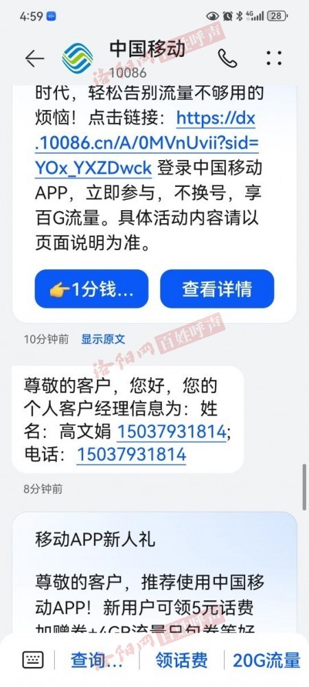 洛阳中国移动通信总是给老年人打电话说免费开通项目,然后扣费,每次回家就会发现父母手机给莫名开通一些无关紧要的扣费项目,打人工客服要求停,人说48小时内等着电话联系,联系时父母又听不懂你们的专业术语,我们不是时时刻刻跟父母在一起的,哪能一直拿着父母的电话接听你们的回复,停扣费项目,过程繁琐,近两年一直都是这情况,谁给你们的权利乱开通扣费项目,再发现我们就准备起诉你们中国移动