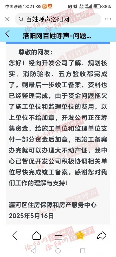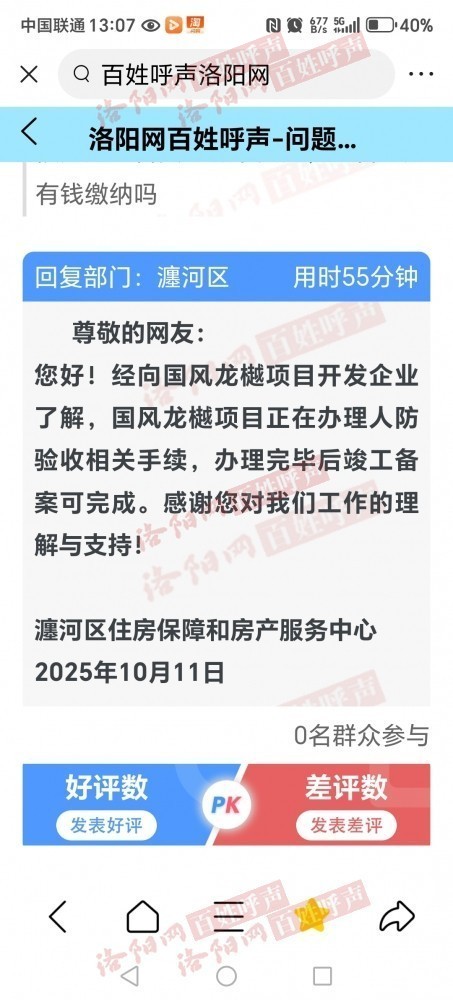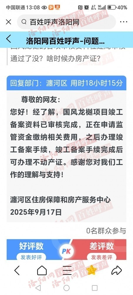 请问国风龙樾不动产证,你们在电视上承诺的8月初就可以办理!现在已经过去两个多月了,职能部门对百姓的承诺就是这样吗?最初因开发商欠施工和监理方资金没法办理;接着竣工备案后办理不动产证;中间出来个消防验收没通过无法办理;然后申请监管账户资金缴纳费用后;到现在又出来个等待人防工程验收;请你们看看你们一次次的答复是在为民谋福祉吗?