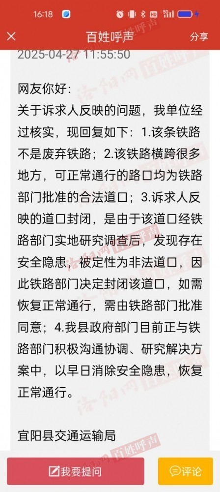 县各级、各部门领导,就是这么糊弄老百姓的吗?同样一条废弃的铁路,怎么一边有安全隐患一边就没有了。这条铁路横跨这么多地方,没见哪个位置立桩堵路的,唯独这条新修的道路被立桩隔断,那当时修路的目的是为啥?难道就是为了立桩方便吗?极力协调道路通畅,并给予明确的措施和时间才是政府应该回复的,不要随便应付了事。