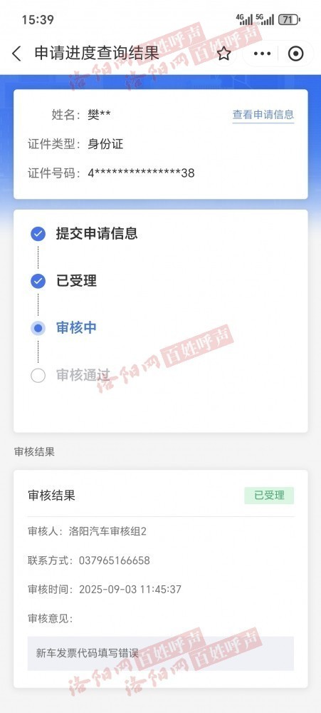 2025年6月15日在洛阳洛龙区海洋馆买的混动比亚迪车,由于当时一时慌张上传资料时,错把发票上传错一张,事后也没人致电告之,一个多月后自己打了电话才知发票上传错。事后又立马上重新把资料上传一遍,一直等待审核通过。现在审核已通过了迟迟未见打款。给审核组打电话一直无人接听。