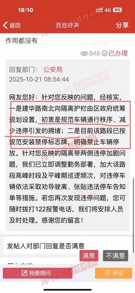 加了隔离护栏,不仅没有阻止违停车辆,反而加剧道路狭窄,白天还行,晚6点到第二天早8,两排停的都是车,白天视野还好,建华路晚上一没路灯,二路面坑洼,再加上两边都是车,居民出行,危险加剧,要么治理违停,要么把建华路翻修一下,路灯整亮点,除了违停,修缮道路的事也加紧解决……