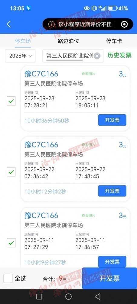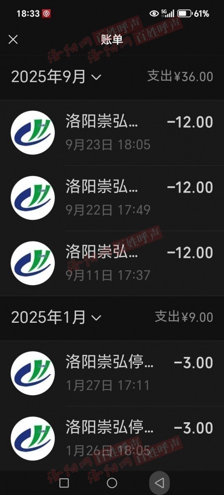 我自己停车记录与实际收费金额不符,连续三次多收费27元,无收费详情,开具发票金额与实际缴费金额不同,存在乱收费等问题!希望有关部门加强监督与管理 商户名称洛阳崇弘停车管理有限公司 停车地点,洛阳市第三人民医院