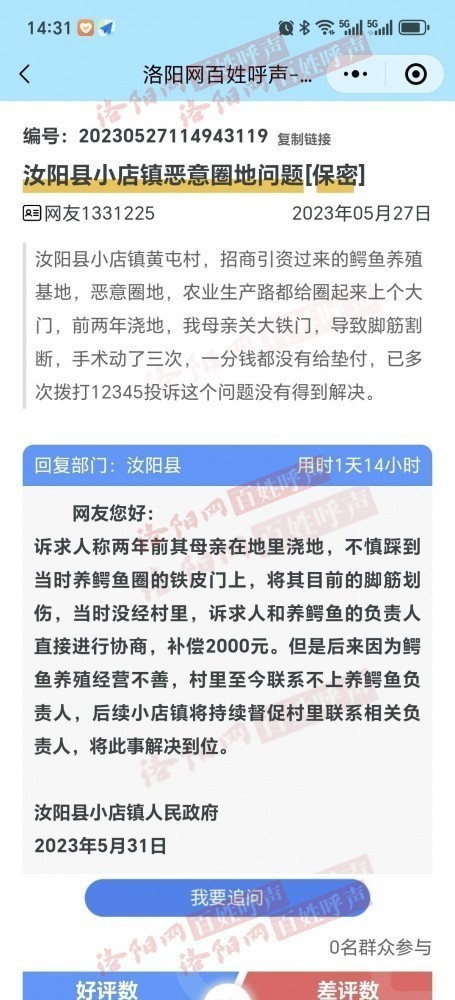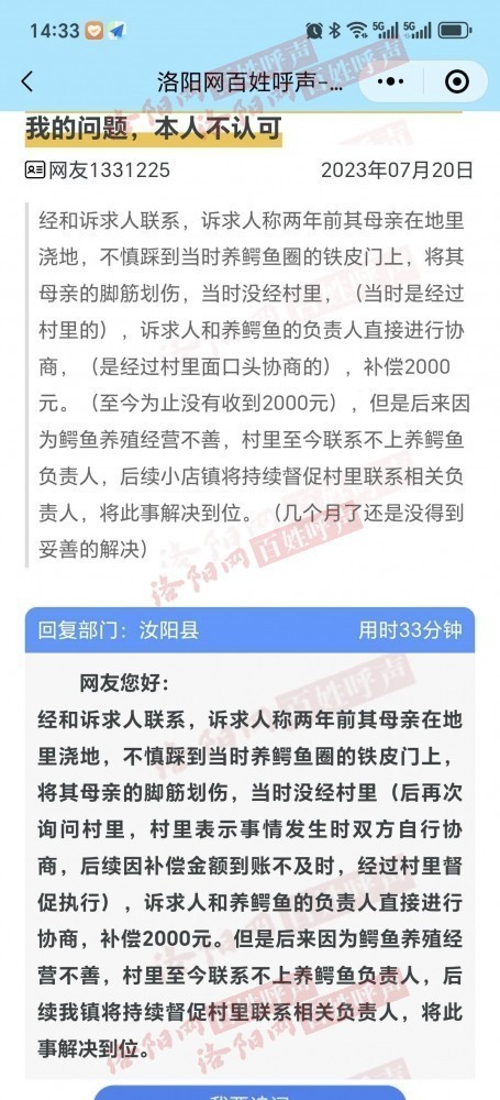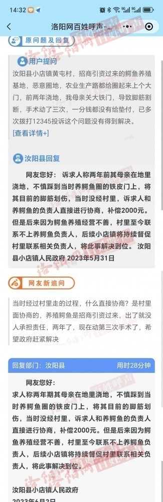尊敬的上级监督部门: 您好! 我是汝阳县小店镇黄屯村村民。今日致信,既是投诉我母亲因当地鳄鱼养殖基地安全隐患受伤、多年诉求在村委两度换届中被持续推诿,更要反映政府部门调查回复失实、罔顾事实的问题,恳请您予以关注并督促解决。 数年前,我母亲在自家农田浇地时,因当地招商引资的鳄鱼养殖基地违规圈占农业生产道路,且其铁皮门存在严重安全缺陷,导致母亲脚筋被割裂。后续历经三次手术,产生数万元医药费、...
