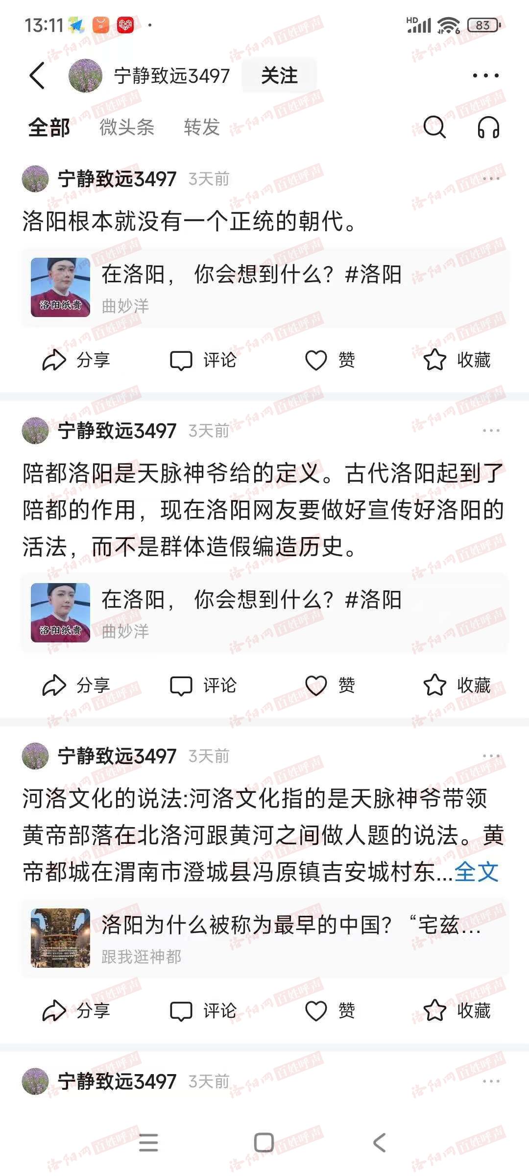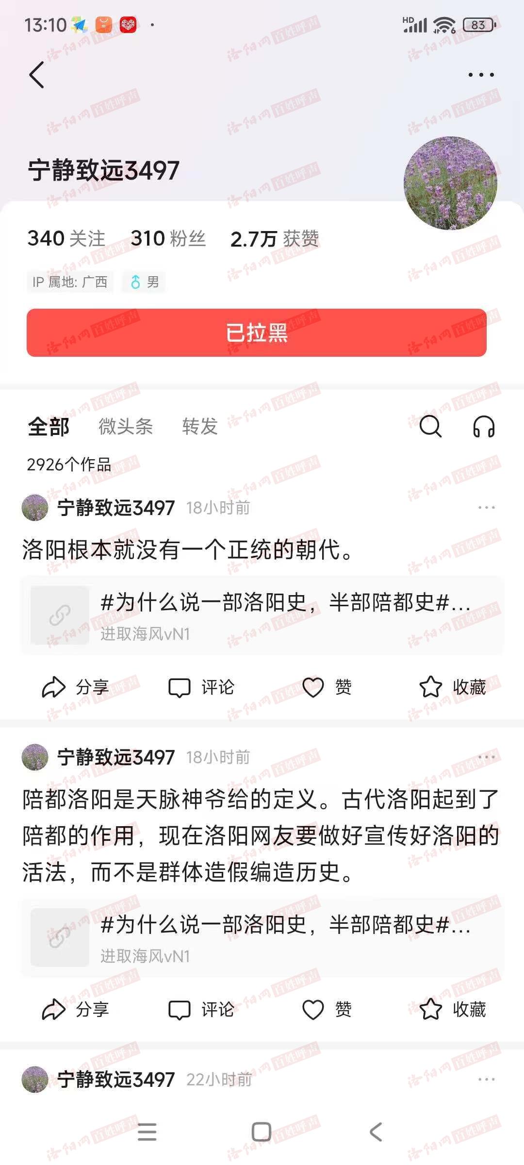 该账户是手机版今日头条账户,该账户全是诋毁洛阳市文化历史文章,全部内容都是宣传负面信息,多次在今日头条举报此账号,也没见他有所收敛,也没有封禁这个账户,希望洛阳市公安局对此账户---宁静致远3497进行追责!