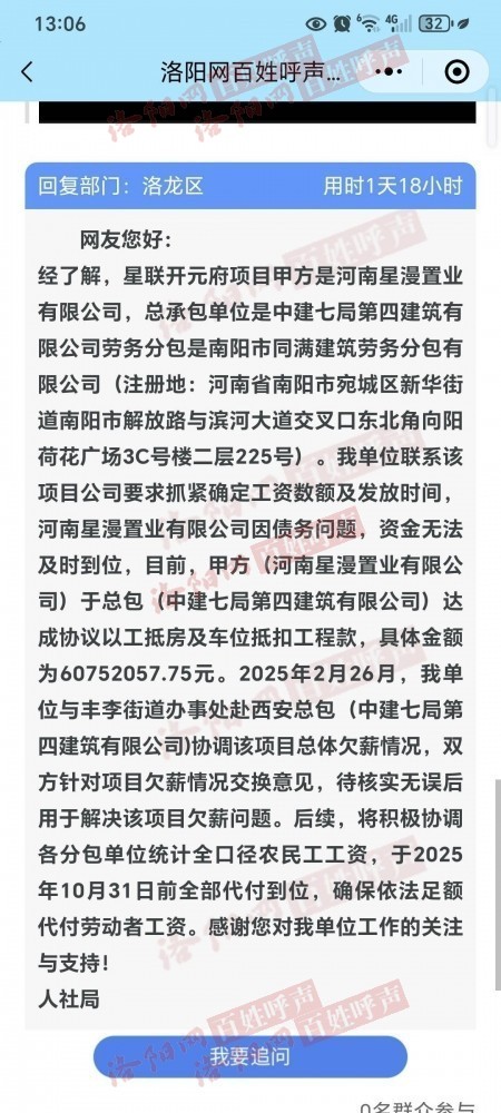 我于2023年7月在洛龙区关林东路洛钢小区参与监控设施改造,施工完成后,总承包一直恶意拖欠26000迟迟不给,到2025年10月长达两年半左右,多次找对方要钱,一直以有关部门不给钱为由恶意拖欠,实在没办法,恳请领导给个说法吧,帮帮老百姓吧!像这种没诚信的无良承包商,是怎么让参与市政工程了。承包商:河南宝源建设工程有限责任公司
