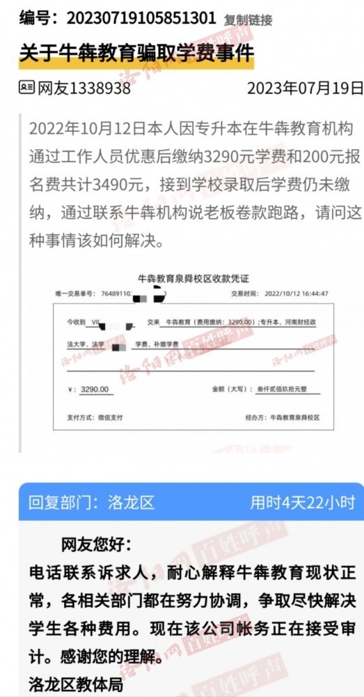 关于牛犇教育机构诈骗学费事件,有关部门是如何解决问题的,这么长时间没有给说法,是工作进度慢,还是准备不了了之,证据确凿就没有能力解决此事。