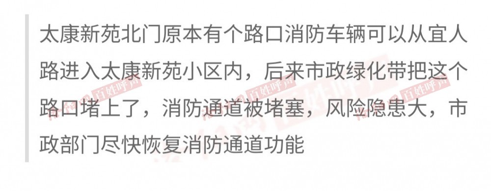 太康新苑北门消防通道原本可以直接通到宜人路上,供消防车辆通行进入小区内部,但宜人路上绿化带重新修理后,消防通道被市政部门的绿化带堵塞,消防通道名存实亡,安全隐患大,要求尽快恢复太康新苑北门消防通道功能,消除人为制造的安全隐患