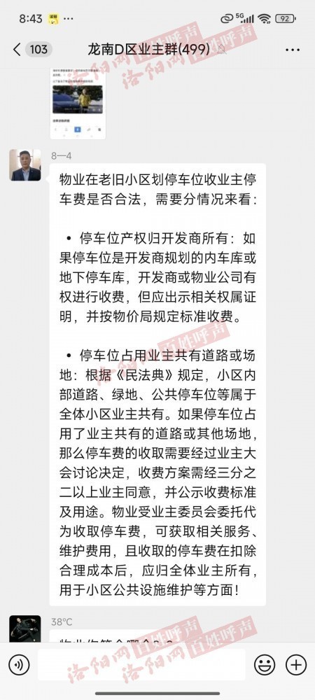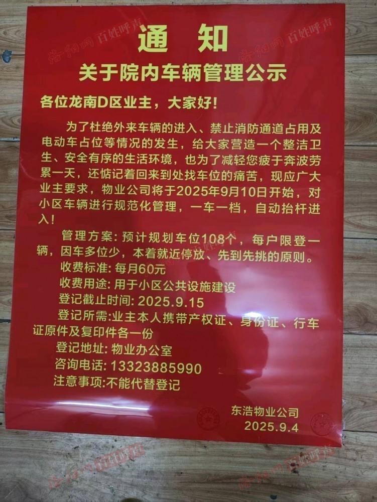 您好!您反映的问题已收悉,经了解,龙南D区属于老旧小区,停车位置有限。因院内车辆乱停乱放、消防通道占用及电动车、僵尸车占位现象严重,存在严重消防安全隐患。因此,小区广大业主强烈呼吁希望对小区进行车位规划并规范管理。经大多数业主同意,物业对小区车位重新规划,方案在小区内公布,并进行了民意调查,结果符合《河南省物业管理条例》第六十六条之规定,属正常车位管理。具体详情可咨询物业公司。感谢您的理解与关注!