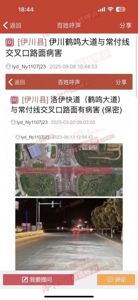 洛伊快道与常付线交叉口路面病害严重,从2023年反映到现在无果,这个月又一次反映,伊川说该位置是洛龙区管辖,详情请看附图