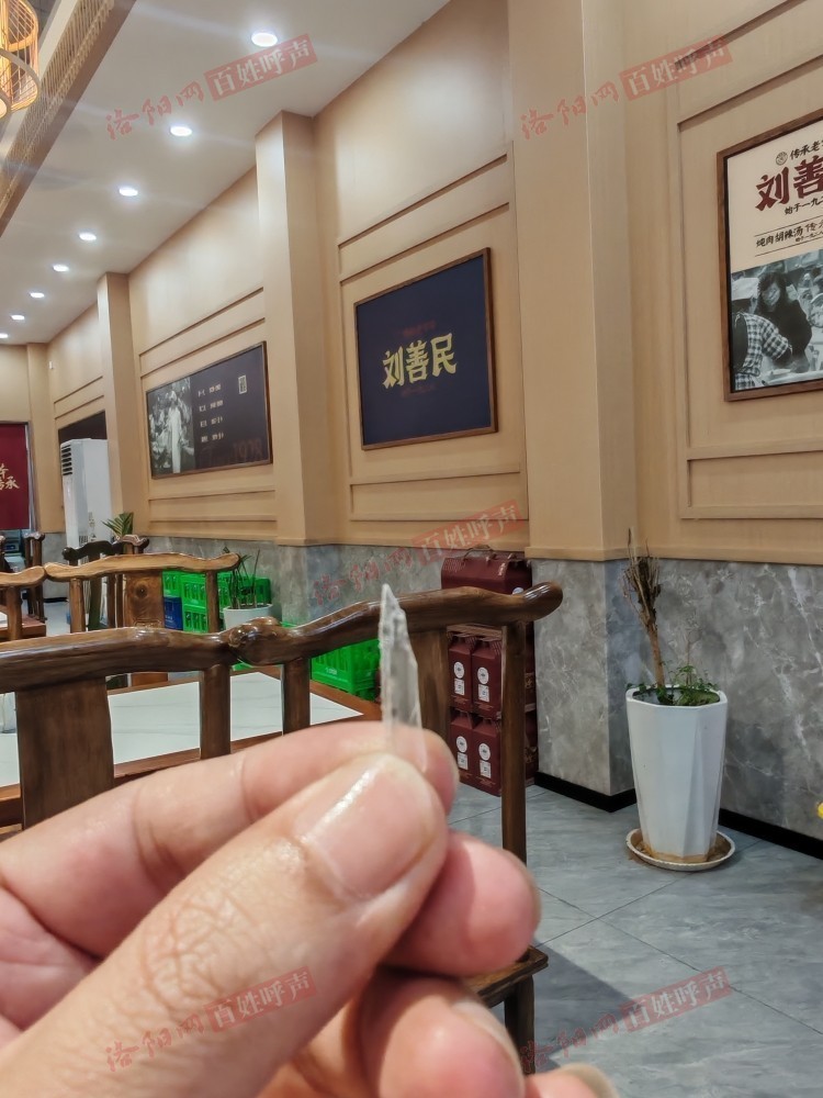 在刘善民炖肉胡辣汤吃出尖锐朔料异物商家拒不道歉很嚣张的说你打12315吧,打了12315该商家属于老城区市邙山场监督管理局,去了监督管理局照片视频都留了第一次商家约我谈话拒不道歉就赔偿就餐金额十倍让我七月份30度的天等了近20分钟才出现,第二次市场监督管理局让商家到市场监督管理局给我打电话联系说赔偿五百元还是拒不道歉,而且市场监督管理局从接到投诉电话就没有去商家店里检查食品安全问题,一大锅的胡辣汤我吃出来异物还继续卖给其他就餐者这本身不是问题吗?最可气的是当天吃出异物服务员说给你换一份要是给你划伤了带你看医生,最后负责人过来说走吧让他打12315呵呵真有底气啊店大有钱就是不一样