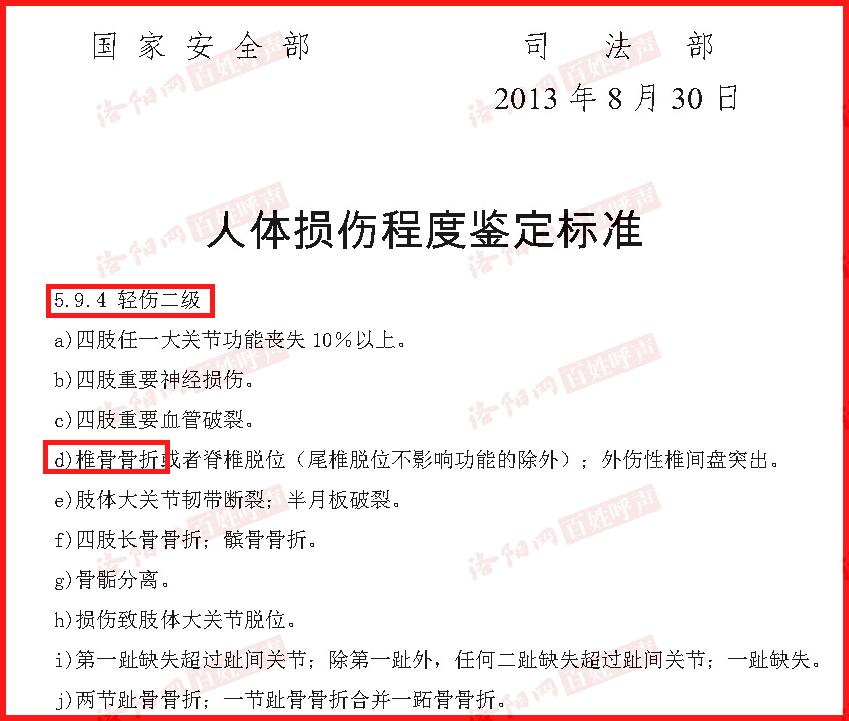 该伤情符合国家安全部、司法部下发的《人体损伤程度鉴定标准》第5.9.4条“轻伤二级”的认定标准,该条d)项的内容就是“椎骨骨折”,见附件图片二。