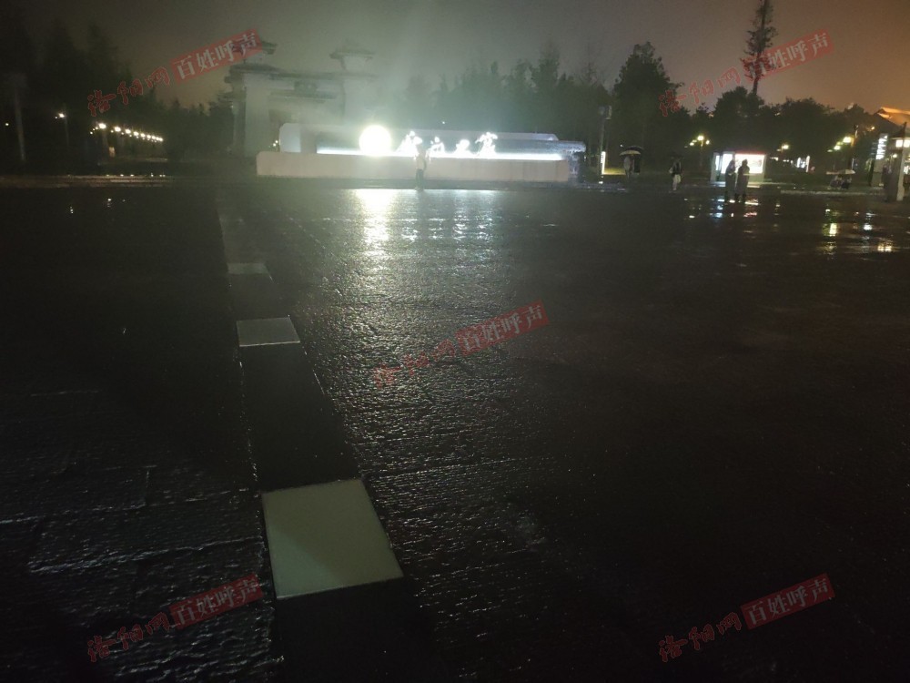 龙门石窟景区门口地面设计的石头中间的白色玻璃块脱落,下雨天内藏大量积水,行人踩上去会突然冒出大量水导致鞋湿。玻璃表面太光滑,下雨天湿水以后特别滑,特别容易摔跤。请尽快处理。