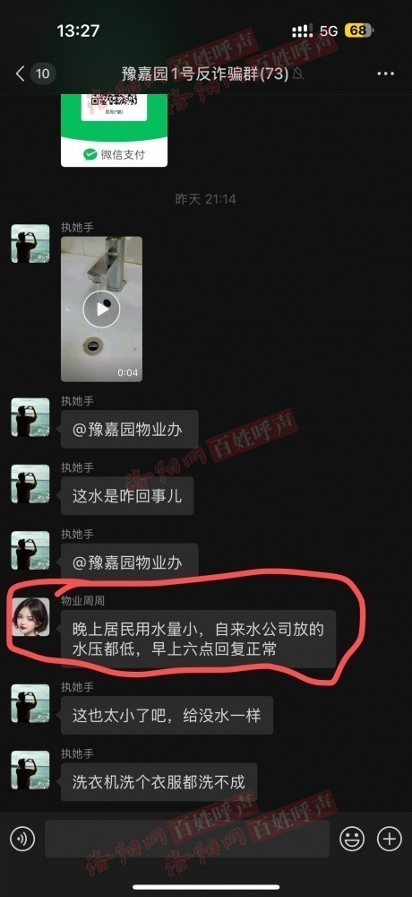 上次有人投诉豫嘉园小区水费5元一吨,正常水费4.2元一吨,相关部门回复因豫嘉园小区供水为加压供水,电费均摊一吨0.8元,所以水费5块钱一吨,既然是加压水为什么还有水压不够,满足不了生活使用要求,物业方对居民反馈水压不够是自来水公司水压不够,小区加压供水事有水池,供压泵,压力水罐进行供水的,豫嘉园的小区到底有没有加压供水?这0.8元的加压费是否收取合理?如果有加压供水小区物业管理人员为什么说压力小是自来水公司的问题?那是不是小区都没有加压供水设施,如果有,没有起到作用是设备没来还是设备就是坏的,这每个月每家每吨的0.8元是不是乱收费,如果是设备问题是不是小区物业根本没有尽到物业职业,这个物业费收取是否合理