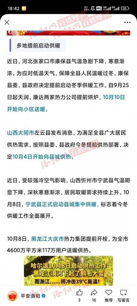 今年北方多地已经提前供暖,洛阳近期持续降雨,气温逐步下降,天气预报显示20高开始气温降低至10℃以下,加之阴雨不断,天气潮湿,建议政府可以考虑让热力公司提前供暖。