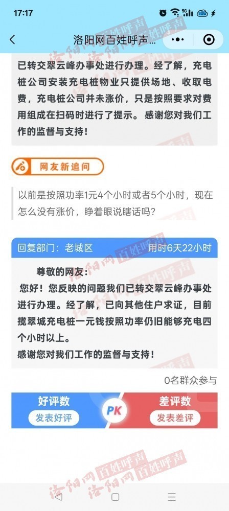 民生问题一直不给解决,回复的理由含糊其辞,谁家两轮电动车充一次电需要三块钱?一度电5毛多就要收取8毛钱的服务费?居民最早反应过这个问题,翠云峰办事处给出的官方结论是并没有涨价。怎么可能,事实明摆着的,就是睁眼说瞎话